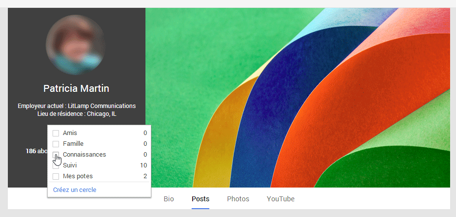 Vous pouvez aussi afficher le profil d’une personne en cliquant sur sa fiche, puis l’ajouter à vos cercles, grâce au bouton figurant à gauche en dessous du nom.