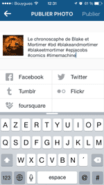 Au moment de poster une image sur Instagram, l’application vous propose de la partager également sur Facebook, Twitter, Tumblr, Flickr ou Foursquare. Si vous le faites, la légende que vous rédigez pour Instagram est également reprise sur les autres plateformes.