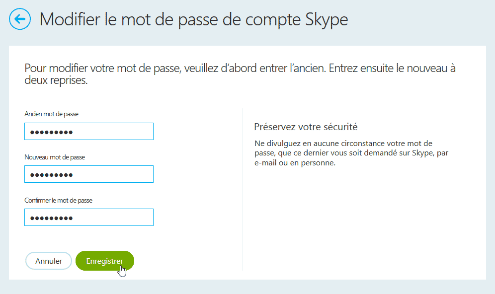 Si vous possédez un compte Skype, vous êtes amené à taper le mot de passe puis indiquer à 2 reprises le nouveau mot de passe. Cliquez enfin sur Enregistrer.