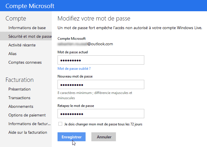 S’il s’agit d’un compte Microsoft, vous devrez taper l’adresse et le mot de passe pour vous identifier. Vous êtes ensuite amené à retaper le mot de passe actuel et à taper 2 fois le nouveau mot de passe. Cliquez sur Enregistrer.